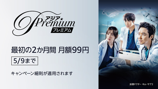PLAN Kエンタテインメント株式会社(東京都品川区、代表取締役社長 崔相基)は、Amazon Prime Videoチャンネルに開局したアジアコンテンツ専門チャンネル『ドラマ&エンタメ☆アジアPremium』(以下、アジアプレミアム)にて、4月26日(水)〜5月9日(火)の期間、新規または再加入でご登録いただいた方を対象に、最初の2ヵ月間・月額99円でお試しいただけるお得なキャンペーンを実施いたします。