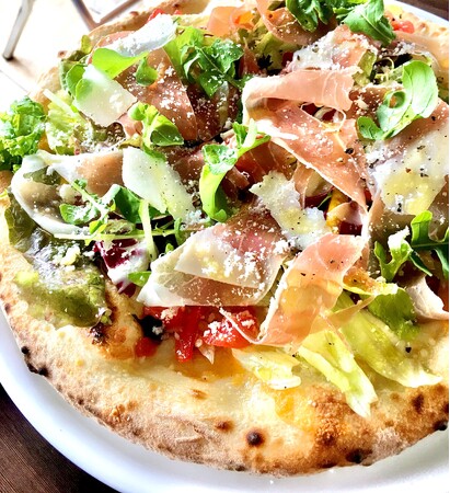 薪窯を積んだトラックで、焼き立てのピッツァを提供。薪窯ならではの香ばしい匂い、外はサクッと中はもちっとした食感を楽しめます。一番人気は「生ハムのサラダピッツァ」。焼き立てのピッツァの上に、イタリア産の生ハムと葉野菜をたっぷりとのせました。特製のドレッシングでお召し上がりください。