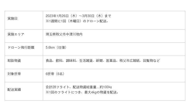 株式会社エアロネクスト(東京都渋谷区、代表取締役CEO田路 圭輔、以下、エアロネクスト)は、「&(アンド)プロジェクト」*1に参画し、2023年1月26日(木)から実施した、土砂崩落の影響が続く秩父市中津川地内で、ドローンによる物資の定期配送(以下、本取り組み)を実施し、3月30日(木)を最終便として、予定期間の配送を完了しました。
