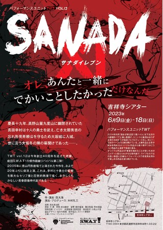 パフォーマンスユニットTWT(主宰:木村孔三)主催、パフォーマンスユニットTWT第12回公演『SANADA XI』が2023年6月9日 (金) 〜2023年6月18日 (日)に吉祥寺シアター(東京都武蔵野市吉祥寺本町1丁目33番22号)にて上演されます。 チケットはカンフェティ(運営:ロングランプランニング株式会社、東京都新宿区、代表取締役:榑松 大剛)にて5月13日(土)12:00より一般発売開始です。