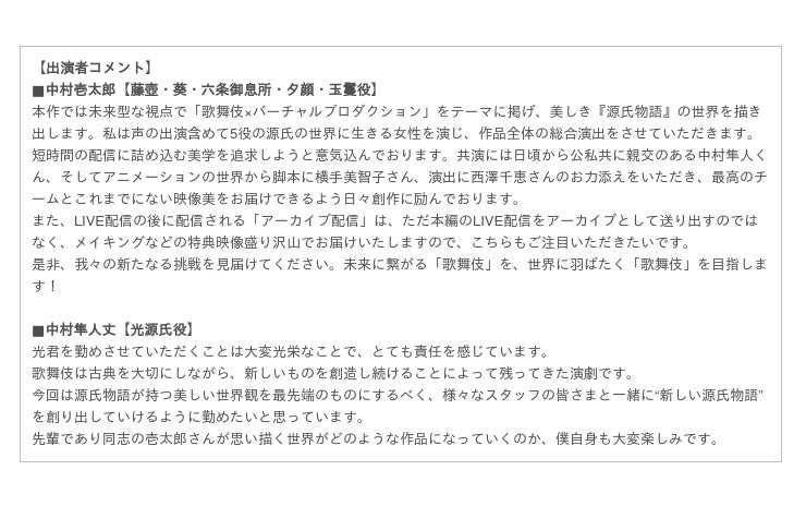 脚本は『プリンセスチュチュ』『SHIROBAKO』『天地創造デザイン部』など数多くの名作アニメを生みだし続けている横手美智子が担当。また、『呪術廻戦』『THE GOD OF HIGH SCHOOL』で演出を手掛けたアニメーターの西澤千恵が演出に協力。 歌舞伎俳優、人気アニメの脚本家・演出家、そしてバーチャルプロダクションの技術チームがタッグを組み、 『源氏物語』の古典の和の世界を、新感覚のショートストーリーとして配信いたします。