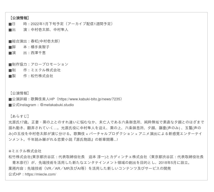 松竹は、2022年1月に『META歌舞伎 Genji Memories』の配信公演の実施を決定致しました。