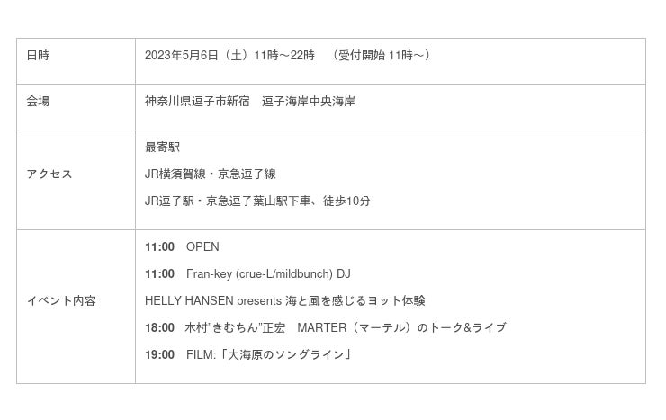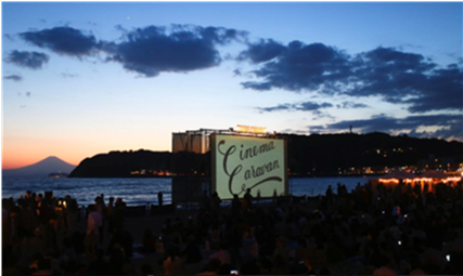 期間中は逗子海岸中央広場に移動遊園地や巨大スクリーンが登場し、5月6日に上映されるのは「大海原のソングライン」。