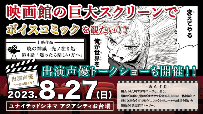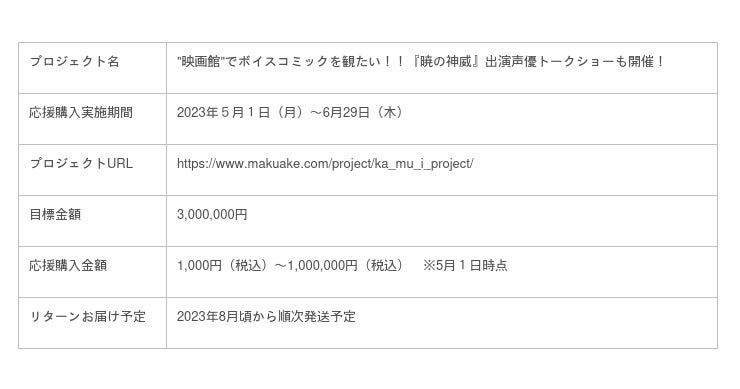 株式会社AVENGEは、神威プロジェクトを立ち上げ、「想いをカタチづくる」というコンセプトのもと、ボイスコミック『暁の神威 -光ノ在り処-』を制作し、2023年4月13日よりYouTubeにて配信スタートしました。このボイスコミックを通じて、日本の宝である漫画家や声優、クリエイターの方々が活躍できる場を広げるお手伝いをしたいと考えています。 さらに作品の魅力をより多くの方に知ってもらい、作り手側とファンとの距離を縮めるため、応援購入サービス「Makuake」にて【”映画館”でボイスコミックを見たい!!『暁の神威』出演声優トークショーも開催!】応援プロジェクトを2023年5月1日(月)より開始いたしました。 URL: https://www.makuake.com/project/ka_mu_i_project/