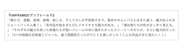 この度、株式会社Watcha Japan(本社:東京都千代田区、代表取締役兼CEO:黒田 淳一)は、映画好きのための月額動画配信サービス「WATCHA(ウォッチャ)」にて初のオリジナルショートフィルムプロジェクト『UNFRAMED/アンフレームド』の4作品を、12月22日(水)より一挙独占配信開始いたします。配信に際し、監督や出演者が制作の裏側を語る3分を超えるメイキング映像が到着いたしました。