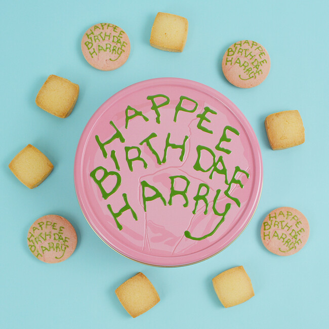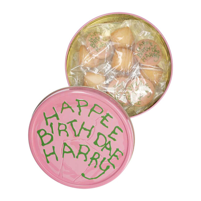 映画『ハリー・ポッターと賢者の石』の中で、ハグリッドがプレゼントしたハリーのバースデーケーキのデザインが、クッキー缶になって登場します。「HAPPEE BIRTHDAE HARRY」の文字の凹凸加工が施された、ポップでかわいらしいピンクの缶のなかには、同じくバースデーケーキデザインのイチゴ味のクッキー4枚と、バター風味のスクエア型クッキー6枚がアソートされています。中のクッキーは個包装のため、小分けにして配ったりなど、行楽シーズンのお土産にもぴったりです。また、クッキーを食べ終わった後の缶は、小物入れとしてもご使用いただけます。