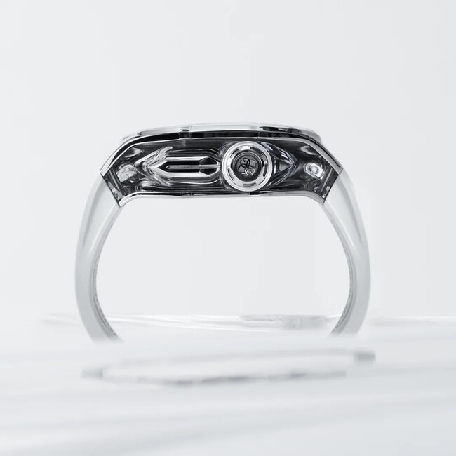 各所に施されたポリッシュ仕上げが全体を引き締め、メリハリのあるエッジの効いたデザインに仕上がっています。また、ミドルケースにはポリカーボネイト製の半透明素材を使用するなど、ユニークな素材選びも特徴のひとつです。