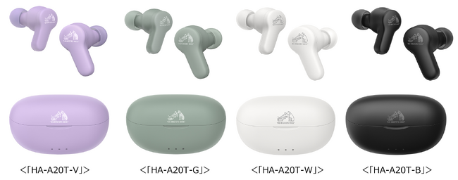 コロンとした丸みがあり、柔らかい印象のあるデザインと癒しのある優しいカラーを採用。カラーバリエーションは、ベーシックカラーのホワイトとブラックに加えて、日常の癒しになるパープル、グリーンの4色をラインアップしました。また、イヤホン本体と充電ケースには、Victorブランドの象徴である「犬のマーク」をデザインしています。