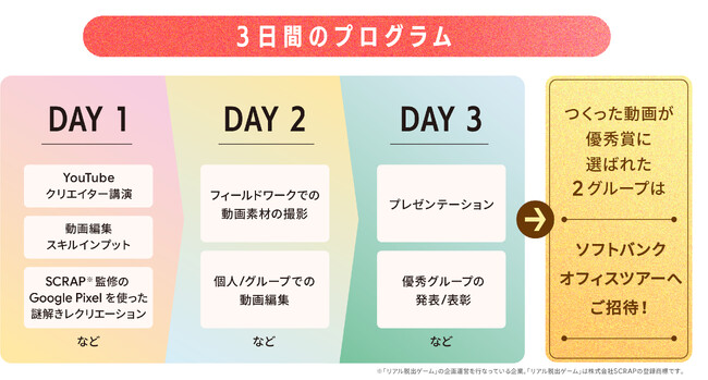 各自治体に在住または通学する中高生を対象に、Google Pixel とChromebookを活用し、3日間のワークショップ形式で「創造力を育み、アウトプットする力を身につけるプログラム」を実施し、地元の魅力を発信する動画を制作していただきます。各自治体で優秀賞に選ばれた動画を制作した中高生(2グループ)には、ソフトバンクのオフィスツアーへ招待や、Google の社員との質問セッションなどを予定しています※1。