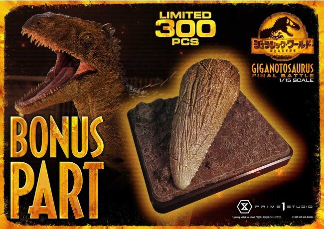 さらにプライム1スタジオ公式オンラインストア限定の本ボーナス版には、ギガノトサウルスの牙が購入特典として付属。鮫の歯を思わせるノコギリ状の縁や無数に刻まれた傷跡まで作り込まれた、ワンランク上のディスプレイモデルです。