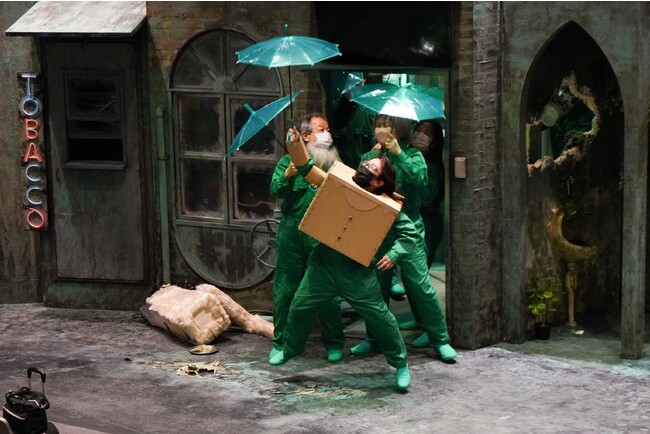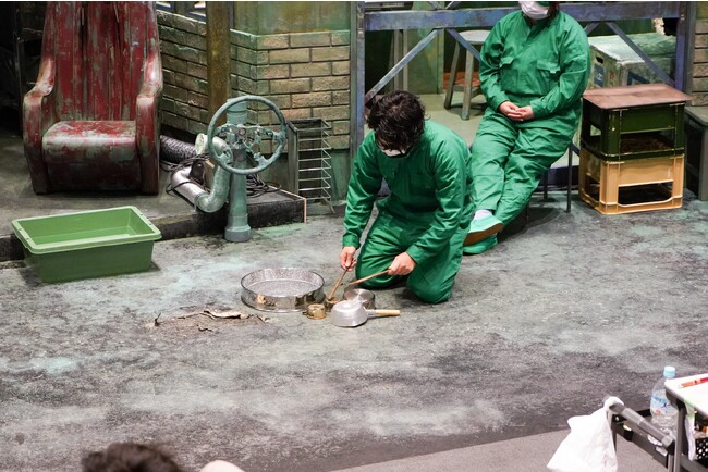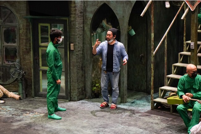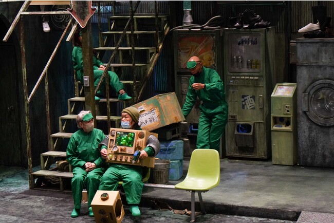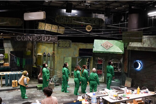 そんな作品を紡ぎ上げる稽古場を訪問した。スタジオには『虹む街』で用意された横浜・野毛をモデルにした飲食店街のセットが組まれている。ただし今回はそこから10年、20年、もしかすると100年先の「街」だ。コインランドリーやスナックはホコリにまみれ、存在がニジんでいるように見える。そのせいで「街」は既に機能を失っているかのように見えるが、もし人々が集まることを「街」の機能とするなら、『虹む街』は辛うじて生きているのだといえるだろう。そこには同じ緑のつなぎを着た人々が、まるで肩を寄せ合うようにして暮らしているのだから。