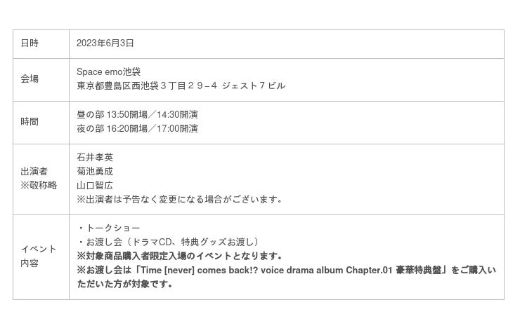※お渡し会は「Time [never] comes back!? voice drama album Chapter.01 豪華特典盤」をご購入いただいた方が対象です。