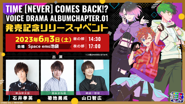 株式会社HIKEが展開するブランド「TRYSTAR(トライスター)」は、2023年6月3日(土)にオリジナル朗読劇『<Time [never] comes back!?>』(以下「ネバカム」)のドラマCD「Time [never] comes back!? voice drama album Chapter.01」初のリリースイベント(会場:Space emo池袋)を開催いたします。本イベントではネバカムのドラマCD発売を記念して、石井孝英さん、菊池勇成さん、山口智広さんのトークショーとお渡し会の実施を予定しています。