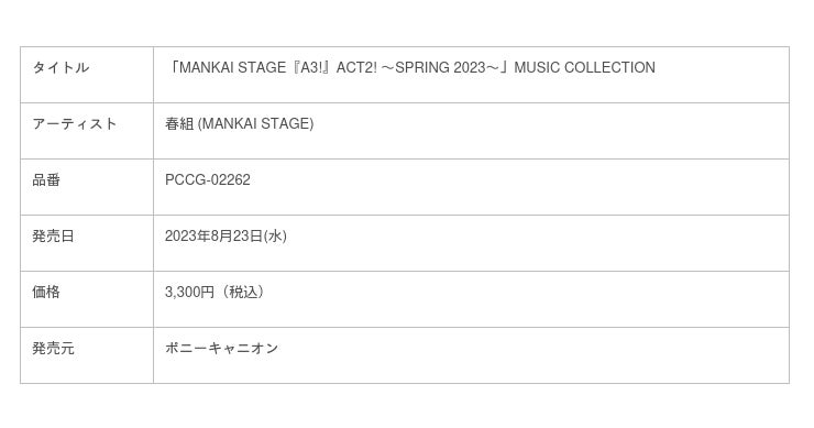 ■MANKAI STAGE『A3!』ACT2! 〜SPRING 2023〜MUSIC COLLECTION詳細