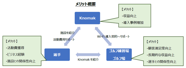 ITの技術支援で企業の業務効率化やセキュリティリスク軽減、利便性向上を行う株式会社Knomak(本社:東京都中央区、代表取締役:小寺俊介)は、2023年5月15日(月)より、GOLFreeWi-Fi紹介キャンペーンを開始いたしました。 選手は必ずゴルフ練習場やゴルフ場、インドアスタジオで練習を行います。選手によっては施設からボール代や練習ラウンド環境の提供を受けていることもあります。本キャンペーンは、そのような繋がりのある施設にて、フリーWi-Fi導入の希望や検討をされている施設がある場合に、選手が当社サービスを紹介することで、選手に当社の営業部隊の一翼を担い、その対価として活動費のサポートをするというものです。