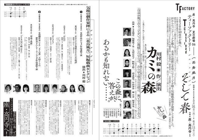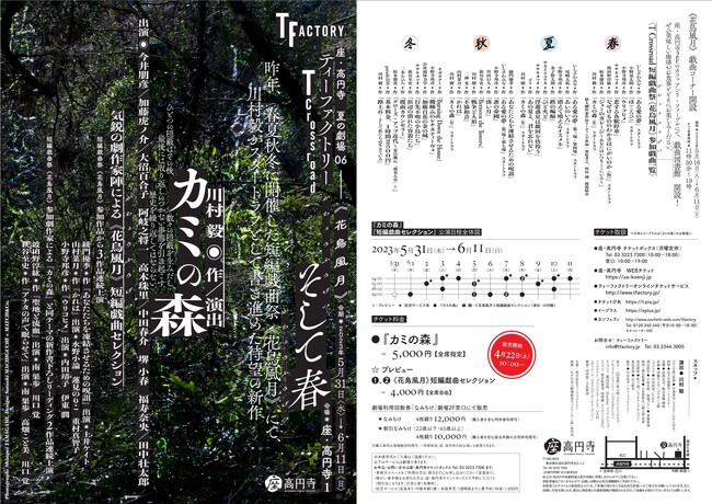 株式会社ティーファクトリー主催、ティーファクトリー T Crossroad<花鳥風月>そして春 『カミの森』『《花鳥風月》短編戯曲セレクション』が2023年5月31日 (水) 〜2023年6月11日 (日)に座・高円寺1(東京都杉並区高円寺北2-1-2)にて上演されます。 チケットはカンフェティ(運営:ロングランプランニング株式会社、東京都新宿区、代表取締役:榑松 大剛)にて発売中です。