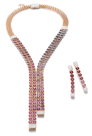 レッドカーペットで輝きを放ったモデルのアレッサンドラ・アンブロジオが身にまとったのは、コレクションの中でも最も魅力的な作品のひとつである「Skyline」ネックレスとイヤリングです。ミラノの革新的な建築物からインスピレーションを受けたアシンメトリーな「スカイライン」ネックレスには、128もの希少なベゼルカットのスピネルがあしらわれ、ミラノの空に広がる夕日をイメージして、暖かく神秘的な緋色から紺碧の色へと変化します。ダイヤモンドのパヴェで仕上げられたソフト&センシュアルで完璧なデザインのネックレスは、12石のスピネルをあしらったイヤリングとコーディネートされ、都市ミラノの常識を超えた美しさと上品なスタイルを見事に映し出しています。