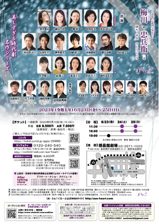2020年5月新型コロナの影響により中止、同年「アートにエールを!」ダイジェスト版の上演を経て、今回、脚本・キャストを一新し、満を持しての本公演です。梅川・忠兵衛は大竹一重と宮原奨伍。特別ゲストの横内 正、原田大二郎、三浦浩一を中心に、イケメン若手俳優やレギュラー女優陣が二人を華やかに盛り上げます。恋の逃避行をする二人の幻想的な場面や廓の女たちの粋で艶やかな衣裳の数々、激しく華麗な立回り、新感覚の「美しすぎる時代劇」あ・うん(ハート)ぐるーぷならではの「梅川忠兵衛」をお楽しみください。