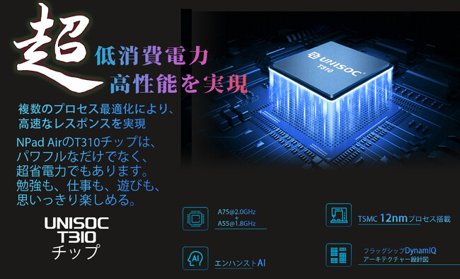 Npad Airは、12nmプロセスのクアッドコア(最大2.0GHz)高性能CPU「Unisoc T310」を搭載しています。