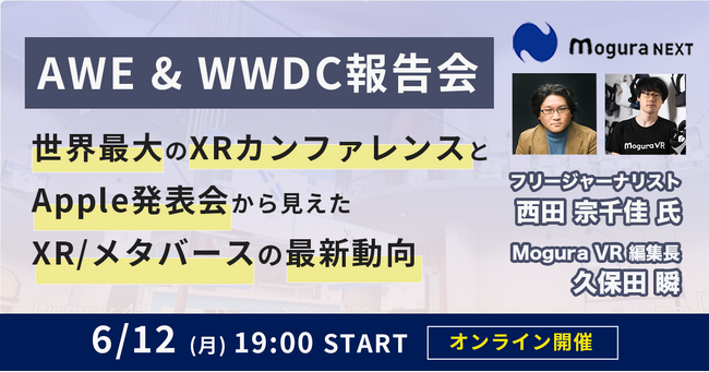 本セミナーでは、今年のAWEに現地参加するMogura VR編集長の久保田、WWDCに参加するジャーナリストの西田宗千佳氏をスピーカーとして、現地で触ったデバイスや見聞きしたXR業界トレンド、最新のユースケースをお話します。
