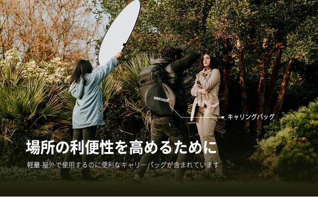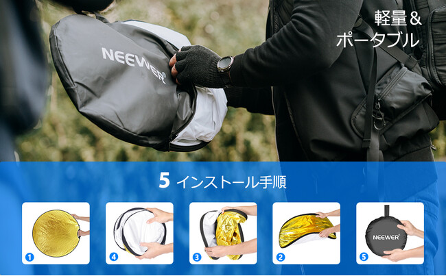 NEEWER 5-in-1リフレクターは軽量で、必要に応じて持ち運びに最適。ケースに収まるように簡単に折りたたむことができ、写真撮影スタジオの照明と屋外照明のさまざまな写真撮影のニーズに対応可能です。