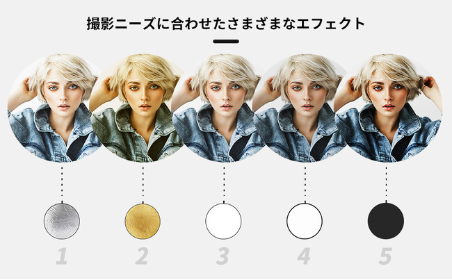 ・【ゴールド:画像をウォームアップする。 シルバー:画像を明るくする。 白:光を影に反射させる。 黒:不要な光を遮断する。 半透明:光を柔らかくし、頭上でよく使用される。】