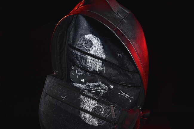クラフツマンシップとシススタイルが融合した特別仕様のダース・ベイダー(TM)バックパックは、ベイダーの象徴的なアーマーにインスパイアされたリッチなレザーとスエードのパターンが特徴です。デス・スター(TM)プリントのインナー、ライトセーバー(TM)を想起させる赤のステッチ、エンパイア・シンボルのジッパーの引き手など、特別なディテールが施され、PCやタブレットを収納するスペースもたっぷりあります。