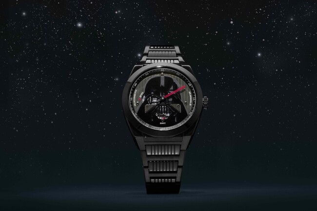 ●ダース・ベイダー(TM)(税込 61,050円): 銀河系で最も恐れられているシスの暗黒卿の座をあなたの腕に。日本製自動巻きムーブメント搭載。ディスク式の時間、秒、24時間表示と、赤いライトセーバーの分針で時刻を表示します。テクスチャーを施した文字盤とブレスレットで、ダース・ベイダーのアーマーを再現したリミテッドエディション。