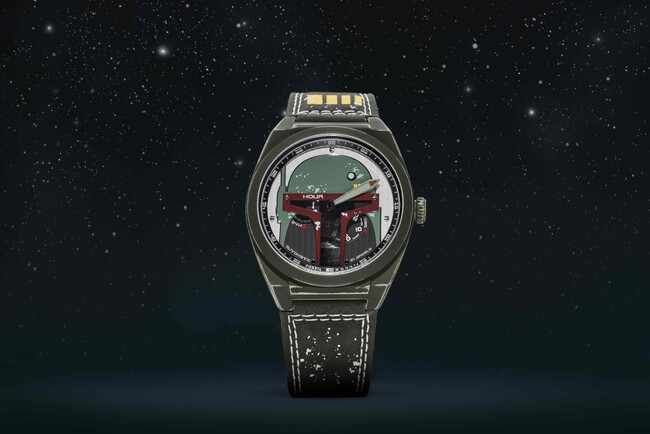●ボバ・フェット(TM)(税込 61,050円): 銀河で最も恐れられている賞金稼ぎのひとりボバ・フェットを再現した、日本製自動巻きムーブメント搭載モデル。ボバ・フェットのアーマーを想起させるエイジング加工を施したケース&ストラップと立体的なダイアルディテールが、大胆不敵で独創的。ディスク式の時間・秒・24時間表示と、ブラスターをイメージした分針を組み合わせています。