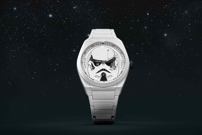 ●ストームトルーパー(TM)(税込 61,050円): ブラスターを構えて、このストームトルーパー リミテッドエディションに狙いを定めよう。白の樹脂コーティングを施したステンレススティールケースとブレスレットに、ダイアル全面でストームトルーパーのヘルメットを再現。ブラスター・ボルトをイメージした分針とディスク式の時間・秒・24時間計を採用した、日本製自動巻きムーブメントを搭載。