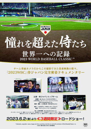 J SPORTS=アスミック・エース共同製作・配給作品、映画「憧れを超えた侍たち 世界一への記録」の初日が決定し、2023年6月2日(金)より3週間限定公開する運びとなりました。本作は2021年12月に栗山英樹氏の監督就任から2023年3月開催「2023 WORLD BASEBALL CLASSIC(TM)」まで、侍ジャパン世界一への軌跡を振り返ります。代表選手30人の選考会議や本大会ベンチやロッカーでの様子など、完全密着したチーム専属カメラだからこそ撮影できた、試合だけでは見ることができない貴重映像満載のドキュメンタリー映画です。
