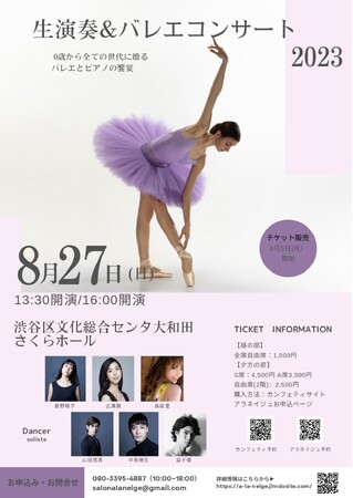 『生演奏&バレエコンサート』が2023年8月27日 (日)に渋谷区文化総合センター大和田 さくらホール(東京都渋谷区桜丘町23番21号)にて上演されます。 チケットはカンフェティ(運営:ロングランプランニング株式会社、東京都新宿区、代表取締役:榑松 大剛)にて6月5日(月)10:00より発売開始です。