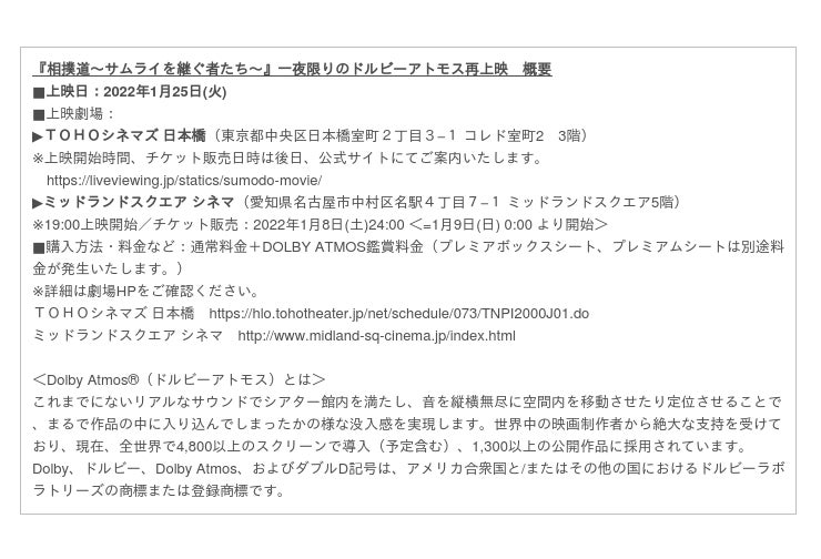 ドルビーアトモス フォーマットで制作された日本初のドキュメンタリー映画『相撲道』が、東京・名古屋にて一夜限りのドルビーアトモス再上映いたします!!