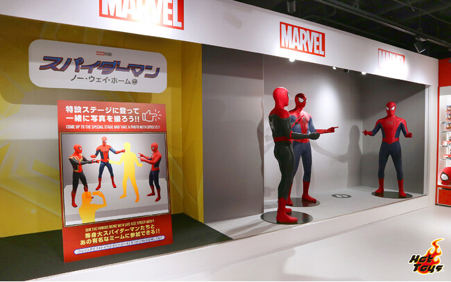 店内の特設ステージに、映画 『スパイダーマン ノー・ウェイ・ホーム』に登場するスパイダーマン(ピーター1・2・3)が、あの有名な指を差し合うネットミームを再現したポーズで登場!サイズは等身大で身長差までリアルに再現されており、まるで本物がいるような感覚を味わえます。”ピーター4”として、スパイダーマンたちと一緒にミームに参加しましょう!