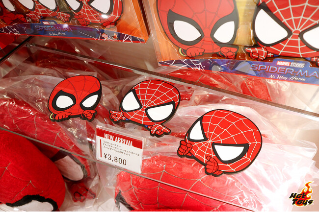 「トイサピエンス」のオリジナルアパレルや、デフォルメフィギュア「コスビ」シリーズなど、スパイダーマンの関連アイテムを多数販売しています。中でも、「コスビ」シリーズの可愛いスパイダーマンのクッションとコースターは、「トイサピエンス」でしか買えない限定アイテム。等身大のスパイダーマン同様、指を差し合うネットミームのポーズをしているので、フォトスポットで写真を撮った記念としても最適です!