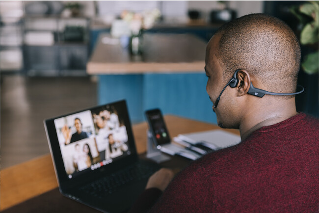 OpenCommは、オープンイヤーデザインにより、周囲の声を聞き逃しません。在宅中のリモートワークでも、インターフォンや電話の着信、家族やペットの呼ぶ声など、家の中で起きていることを把握しながらオンライン会議などの仕事が可能です。ヘッドセットの重量はわずか33gと軽量で、柔軟性のあるフレキシブルなフレームを採用しているため、長時間の仕事でも負担なく使用することができます。