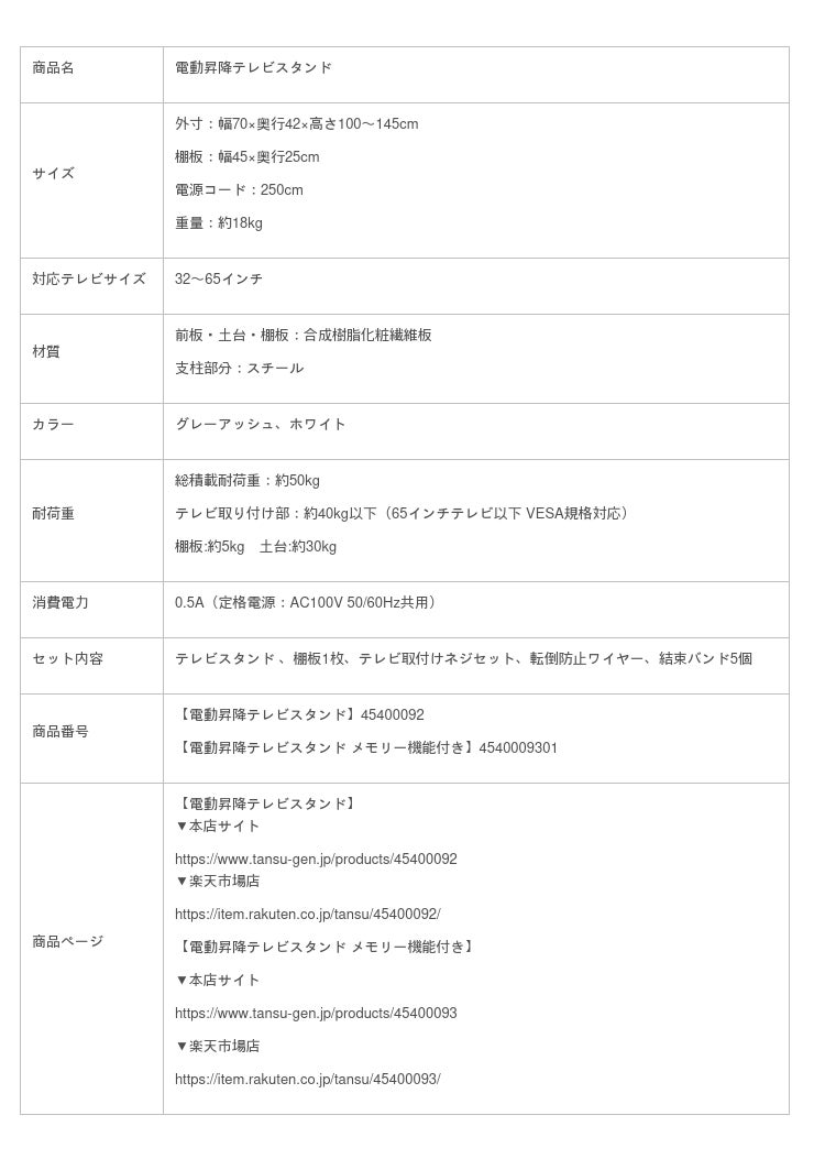 電動昇降テレビスタンド2機種はタンスのゲン本店とタンスのゲン楽天市場店にて取り扱っております。