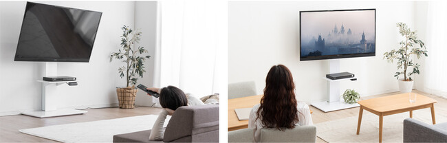 また、本製品は100〜145cmの幅での無段階調節が可能なため、ローソファや床座りといった低い位置での視聴から、ダイニングスペースや台所、立ってゲームを楽しむ際などの高い位置での視聴に対応することができます。