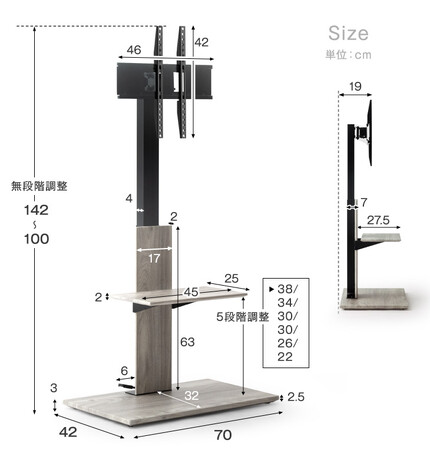棚板は5段階(床からの高さ:27cm、31cm、35cm、39cm、43cm)で高さ調節が可能です。テレビの高さや設置したいものに合わせて高さを変えることができます。