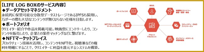 スマートフォンやSNS、動画配信サービスなどの充実により、誰もが一クリエイターとしてコンテンツを創作し発信できるWEB3.0時代、永続的に保管可能な分散型データストレージで、万が一の際も大切なコンテンツが無くならない設計のデータアセットマネジメント、世界中のクリエイター&コンテンツ、ビジネスをマッチングさせることが可能なポートフォリオ、所有権などの権利を明確にしクリエイターに利益を還元するNFTマーケットプレイスの3つのサービスを軸に展開いたします。