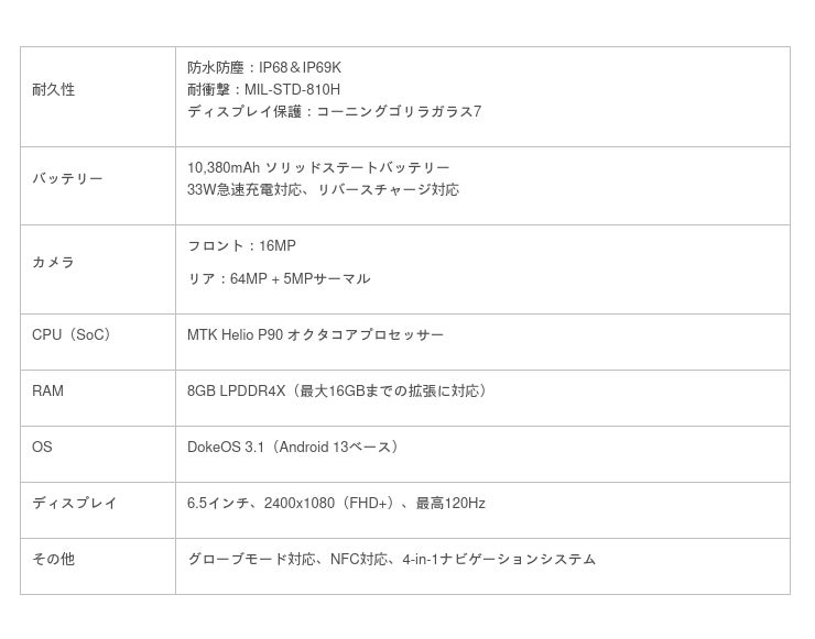 最新のフラッグシップタフネススマートフォンであり、ArcSoft(R) 4.0によりアップグレードされたサーマルイメージングカメラを搭載。10,380mAhの大容量バッテリー、そしてAndroid 13をベースにしたDokeOS 3.1を搭載しています。