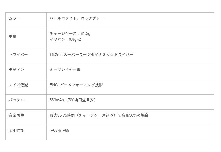 また「ENCノイズキャンセリング」と「ビームフォーミング」技術を組み込んでおり、プライバシーを保ちつつクリアな通話が可能になります。さらに550mAhのバッテリーを内蔵しており、充電ケースと一緒に使用することで最大36時間の連続音楽再生を楽しめます。