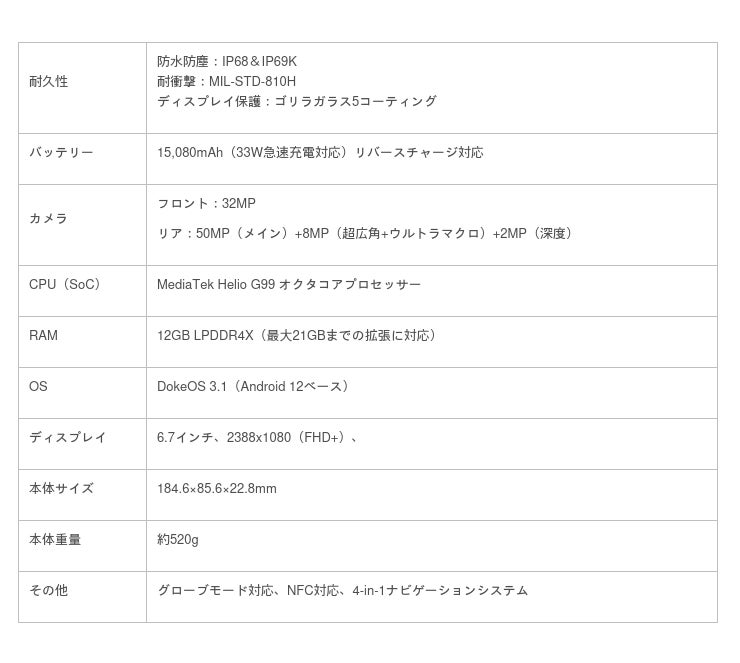 Android 12をベースにしたDokeOS 3.1を搭載しており、もちろんIP68/IP69KやMIL-STD-810Hなどの頑丈さも全て備えています。