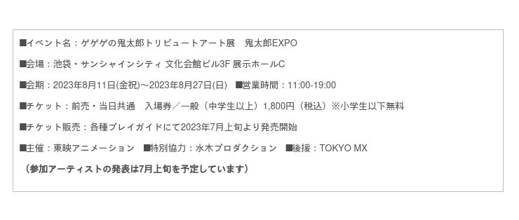 の開催が決定!2023年8月11日(金祝)〜8月27日(日)、池袋・サンシャインシティ 文化会館ビル3F 展示ホールCにて実施いたします。アニメ「ゲゲゲの鬼太郎」が半世紀に渡って発信してきた独創的な作品の魅力を、多種多様な業界のアーティストやクリエーターたちとコラボレーションしながら、新しい熱量を創造・発信いたします!会場で実際にアートを見るだけではなく、展示されるアート作品(一部作品を除く)は後日抽選販売にて購入できる参加型の展示イベントとなります。※購入方法は追ってホームページでお知らせします。