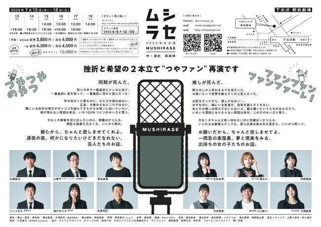 ムシラセ2023年本公演『つやつやのやつ』と『ファンファンファンファーレ!』が2023年7月13日 (木) 〜2023年7月18日 (火)に駅前劇場(東京都世田谷区北沢2-11-8TAROビル3F)にて上演されます。 チケットはカンフェティ(運営:ロングランプランニング株式会社、東京都新宿区、代表取締役:榑松 大剛)にて6月8日(木)12:00より発売中です。
