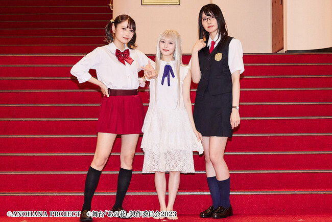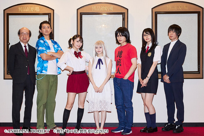 舞台「あの日見た花の名前を僕達はまだ知らない。」2023の製作発表が6月15日(木)に、博品館劇場で行われ、河原田巧也、市川美織、桃月なしこ、駒形友梨、須賀裕紀、脚本・演出の畑雅文、プロデューサーの片岡義朗が登壇した。 爆発的人気キャラクター・本間芽衣子役を演じるのは2022年版舞台でファンから多くの支持を得たNMB48・AKB48出身の市川が続投。さらに、安城鳴子役を桃月、鶴見知利子役を駒形、宿海仁太役を河原田、松雪集役を井阪、久川鉄道役を須賀が演じる。