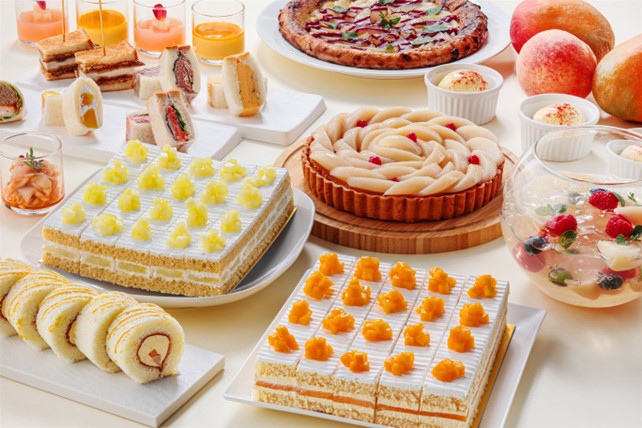 濃厚な完熟マンゴーをたっぷりと使用した「マンゴーショートケーキ」と、糖度14度以上のマスクメロンのみを贅沢に使用し、ショートケーキの最上級品とも言われている通常1カット¥1,836の「スーパーメロンショートケーキ」がビュッフェサイズで登場するほか、マンゴープリンや、ピーチタルトやピーチのコンポートなど、味はもちろん見た目にも涼しげなスイーツが並びます。