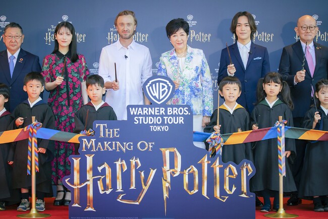 会場では、フィルム スコア フィルハーモニック オーケストラの皆さまによる素敵な演奏で祝福ムードが高まる中、ハリー・ポッターのライバル、ドラコ・マルフォイ役を演じた俳優のトム・フェルトンが登壇。さらに、ハリー・ポッター役の声優小野賢章さん、女優の浜辺美波さんらが出席し、作品やスタジオツアーについて語りました。最後は、地元練馬区の幼稚園に通う子どもたちも駆けつけ、みんなで「アロホモラ」の呪文を唱えると、まるで魔法がかかったかのような演出のテープカットでオープンをお祝いしました。映画「ハリー・ポッター」の映画制作の魔法が詰まった全く新しいエンターテイメント施設であるスタジオツアー東京ならではの体験にどうぞご期待ください。