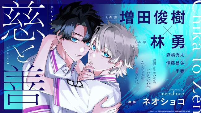 原作となる『慈と善』は、幼少期に母親からとある行為を儀式として強要され続けた双子の兄弟、七森 慈・善が親元を離れ、高校生活を送っていく中で芽生えていく絆や愛を描いた作品。ボイスドラマでは本編後の物語を豪華キャストで紡ぎます。