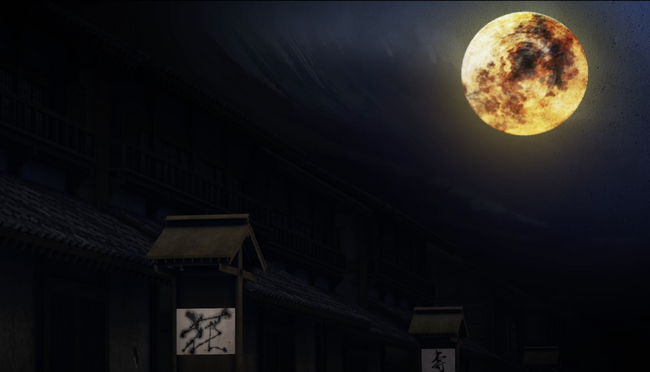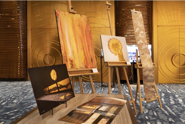 下:月夜に佇む墨アーティスト海老原露巌の書と、箔アーティスト裕人礫翔の月を模した作品が象徴的なシーン。